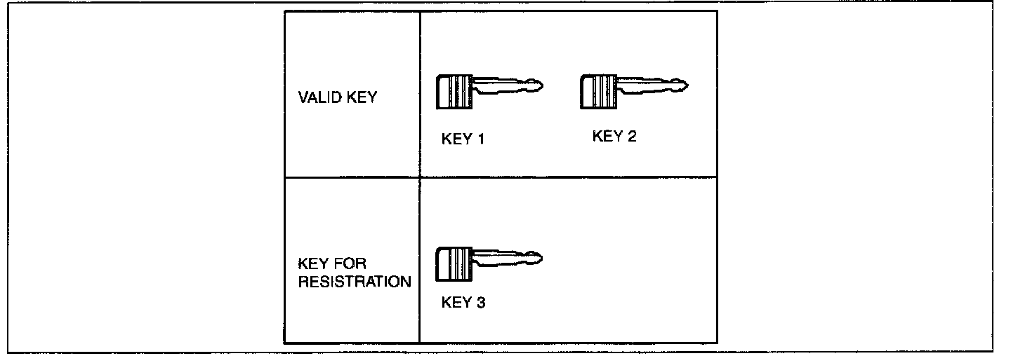 - If eight keys have already been programmed, and it is necessary to program other keys, the previously programmed key ID numbers must first be cleared. To clear the key, refer to "No.3 PCM Replacement Procedure".