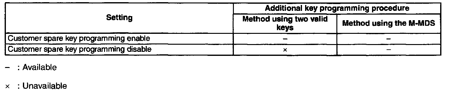 - If "No.1 Additional Key Programming Procedure (Using Two Valid Keys)" is set to disable, the additional key programming can be only performed using the M-MDS preventing the forging of a spare key by using two keys that can start the engine. This function is for use by rental car agencies or other companies with vehicle fleets.
