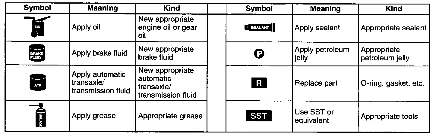 , sealant, and the use of SST or equivalent. These symbols show application points or use of these materials during service.