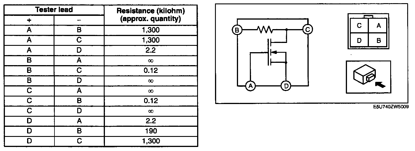 POWER METAL OXIDE SEMICONDUCTOR FIELD EFFECT TRANSISTOR (POWER MOS FET) INSPECTION1. Verify that the resistance between the terminals of the power MOS FET is as shown in the table.