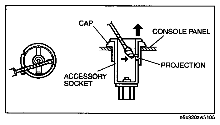 1. While pressing a tape-wrapped flathead screwdriver against the cap projection, pull the accessory socket outward.
