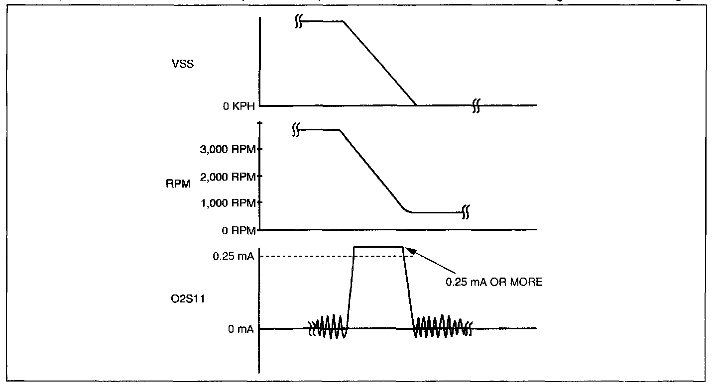 4. Verify that the front HO2S current (PID: 02S1 1) is 0.25 mA or more while decelerating as shown in the figure.
