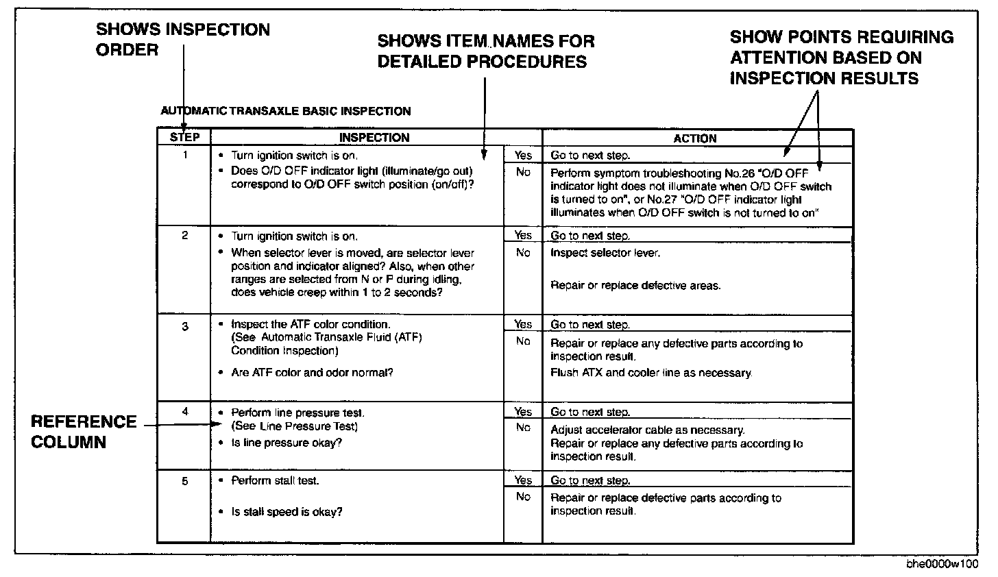 - Although inspections and adjustments are performed according to the reference column procedures, if the cause of the malfunction is discovered during basic inspection, continue the procedures as indicated in the action column.