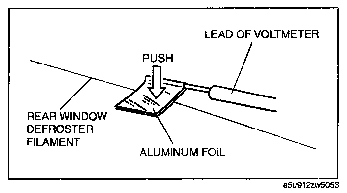 CAUTION: Directly touching the rear window defroster filament with the lead of the voltmeter could damage it. Wrap aluminum foil around the end of the lead and test the rear window defroster filament by touching it with the foil.