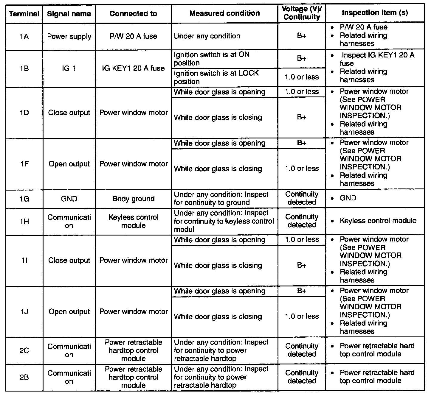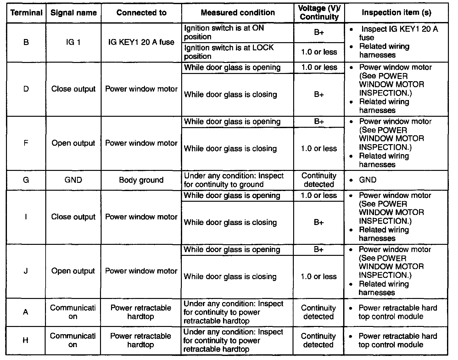 POWER WINDOW MAIN SWITCH INSPECTION [POWER RETRACTABLE HARDTOP]With Exterior Open function