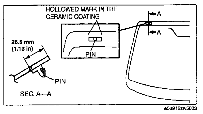 4. Align the marks made before removal and install the pin to the windshield referring to the figure. (when reusing the glass, and the pin was removed)