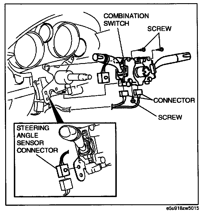 COMBINATION SWITCH REMOVAL/INSTALLATIONWARNING: For vehicles with DSC, if the negative battery cable or the steering angle sensor connector or ROOM 15 A fuse is disconnected, the stored initial position of the steering angle sensor will be cleared and the DSC will not operate properly, making the vehicle unsafe to drive. Perform the steering angle sensor initialization procedure after connecting the negative battery cable.