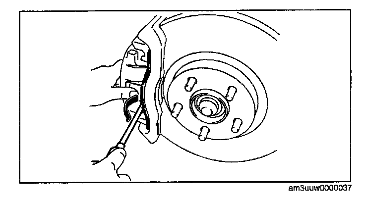 1. Move the retaining clip in the direction shown by the arrow using a flathead screwdriver and remove it from the caliper.