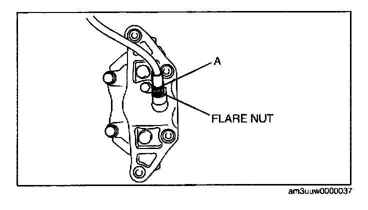 2. Tighten the flare nut while holding the brake hose at point A with a spanner or equivalent.