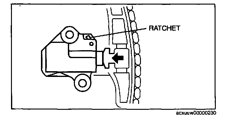 1. Press the timing chain tensioner ratchet to the left using a thin flathead screwdriver (precision screwdriver) to unlock the plunger.