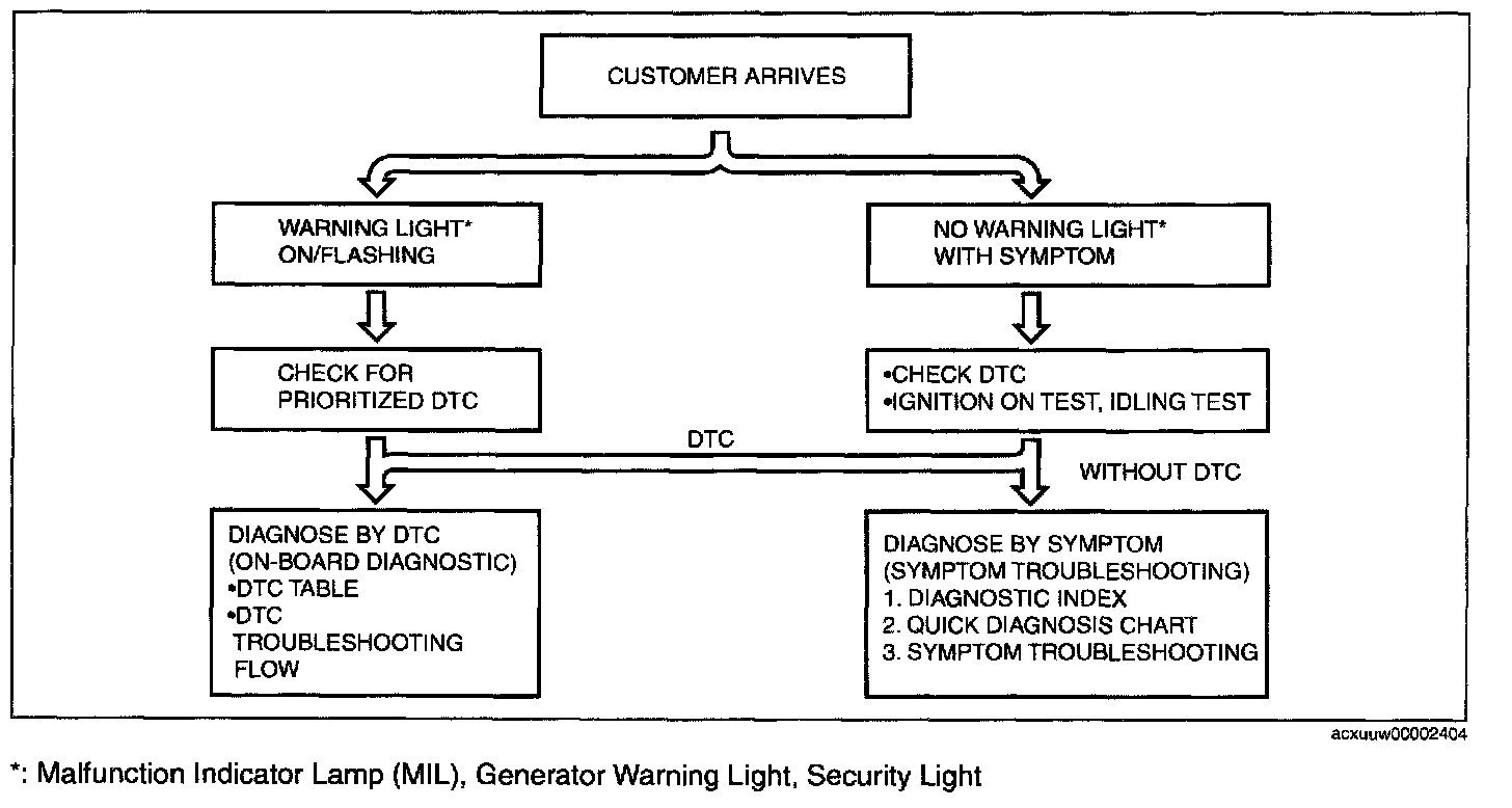 - If a DTC does not exist and the MIL does not illuminate or flash, diagnose the applicable symptom troubleshooting. (See QUICK DIAGNOSTIC CHART[L3 WITH TC].) Quick Diagnostic Chart