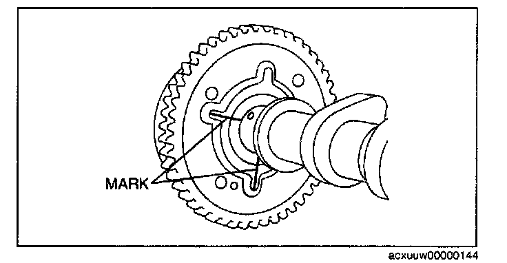(1) Place alignment marks on the camshaft and variable valve timing actuator as shown in the figure so that the variable valve timing actuator is re-assembled in its original position.