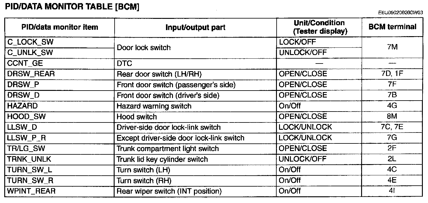 PID/DATA Monitor Table [BCM]: