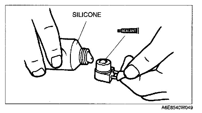 1. Apply approx. 1 g {0.04 fl.oz} of silicone (Shin-Etsu Silicone KE-347W or similar) to the contact surface of the thermal protector, then thoroughly install it onto the A/C compressor, leaving no gaps.