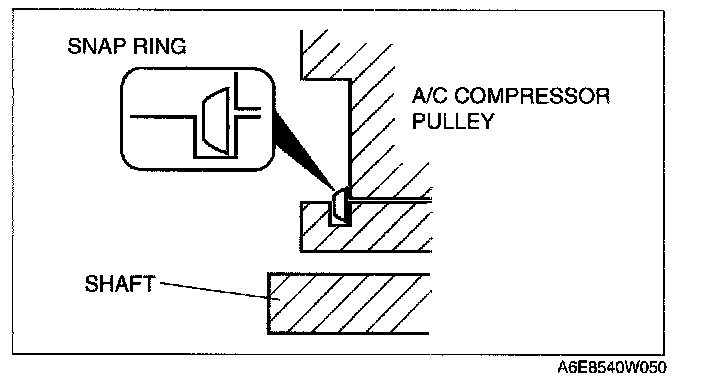 1. When installing a new pressure plate, A/C compressor pulley, stator, or A/C compressor body, replace the snap ring.