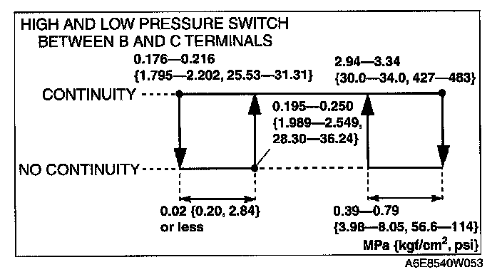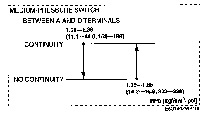 3. Verify the high-pressure side reading of the manifold gauge and continuity between the terminals of the refrigerant pressure switch.