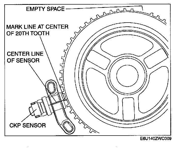 3. Align the center line of the crankshaft position sensor and the line drawn in STEP 2, then install the sensor.