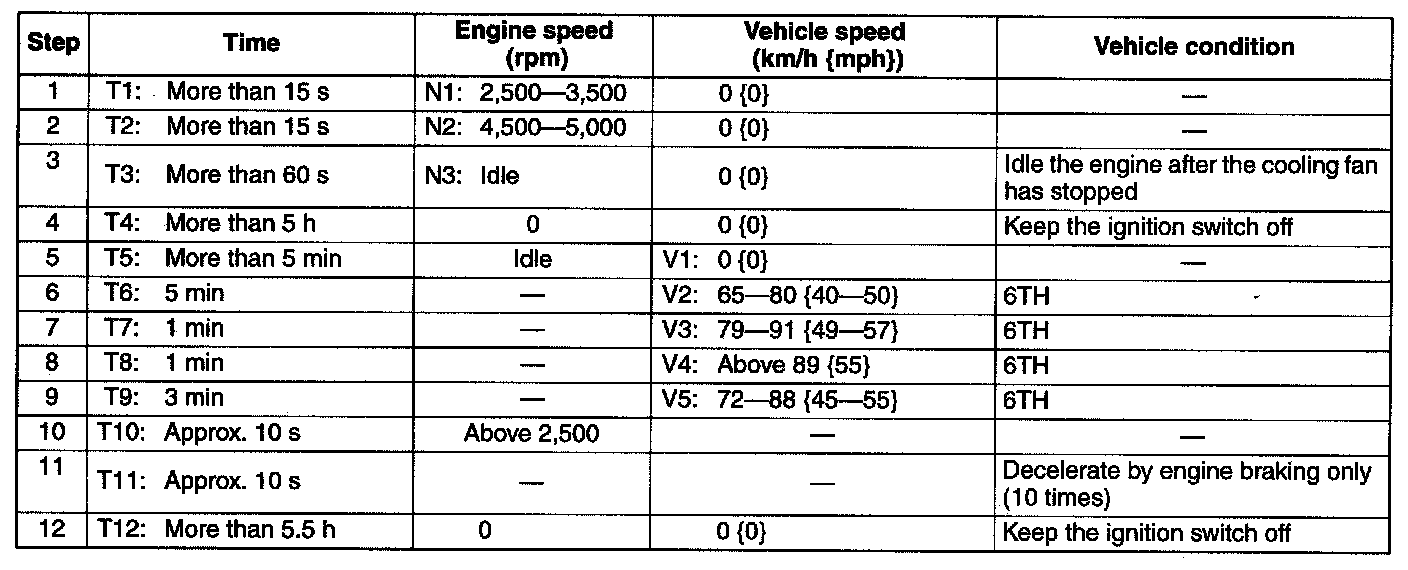 6. Drive the vehicle at an engine speed of 65-30 km/h {40-50 mph} for more than 5 mm.