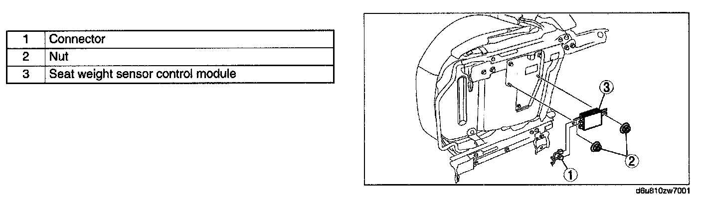 SEAT WEIGHT SENSOR CONTROL MODULE REMOVAL/INSTALLATION[L3 WITH TC]CAUTION: When the seat weight sensor control module Is replaced with a new one, perform the seat weight sensor calibration using the M-MDS. (See SEAT WEIGHT SENSOR CALIBRATION.) Programming and Relearning