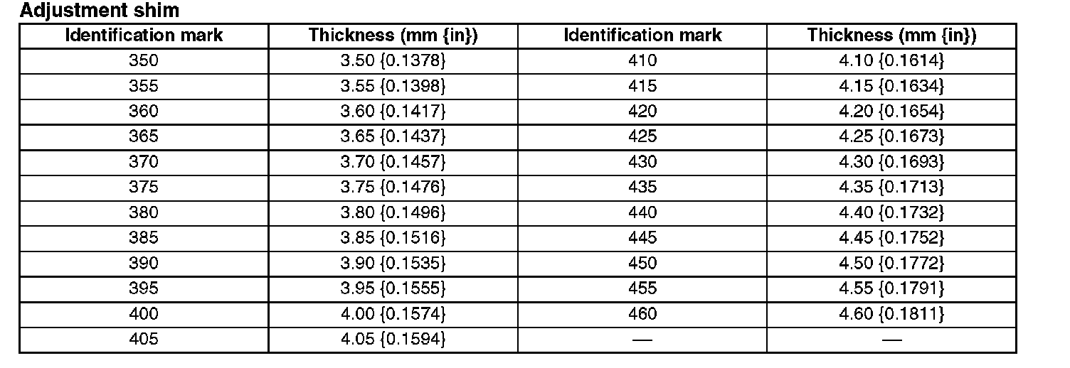 9. If the total thickness of the installed adjustment shims is not within the C range, select the appropriate number of adjustment shims from the table below and use them.