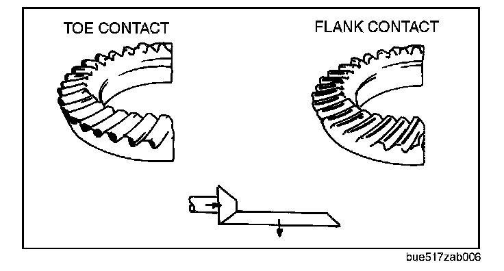 4) If toe and flank contact is indicated as shown in the figure, replace the drive pinion spacer with a thinner one to maintain the drive pinion further away.