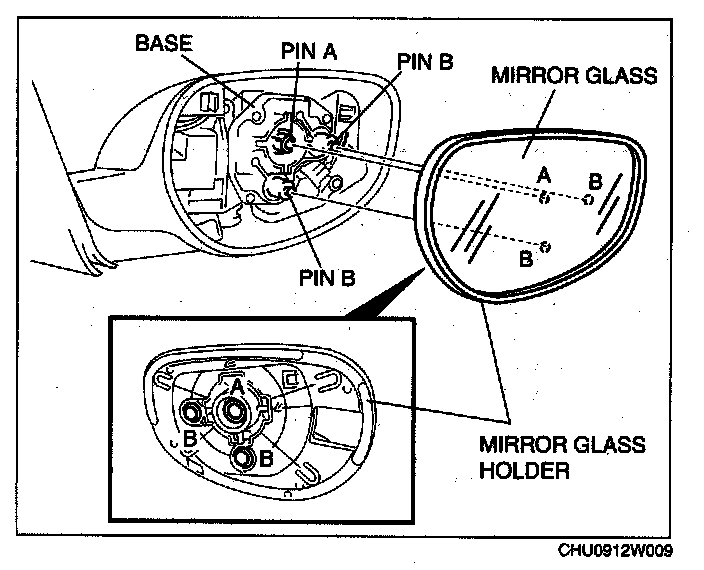 2. Detach pin A while lifting up the inside of the mirror glass holder.