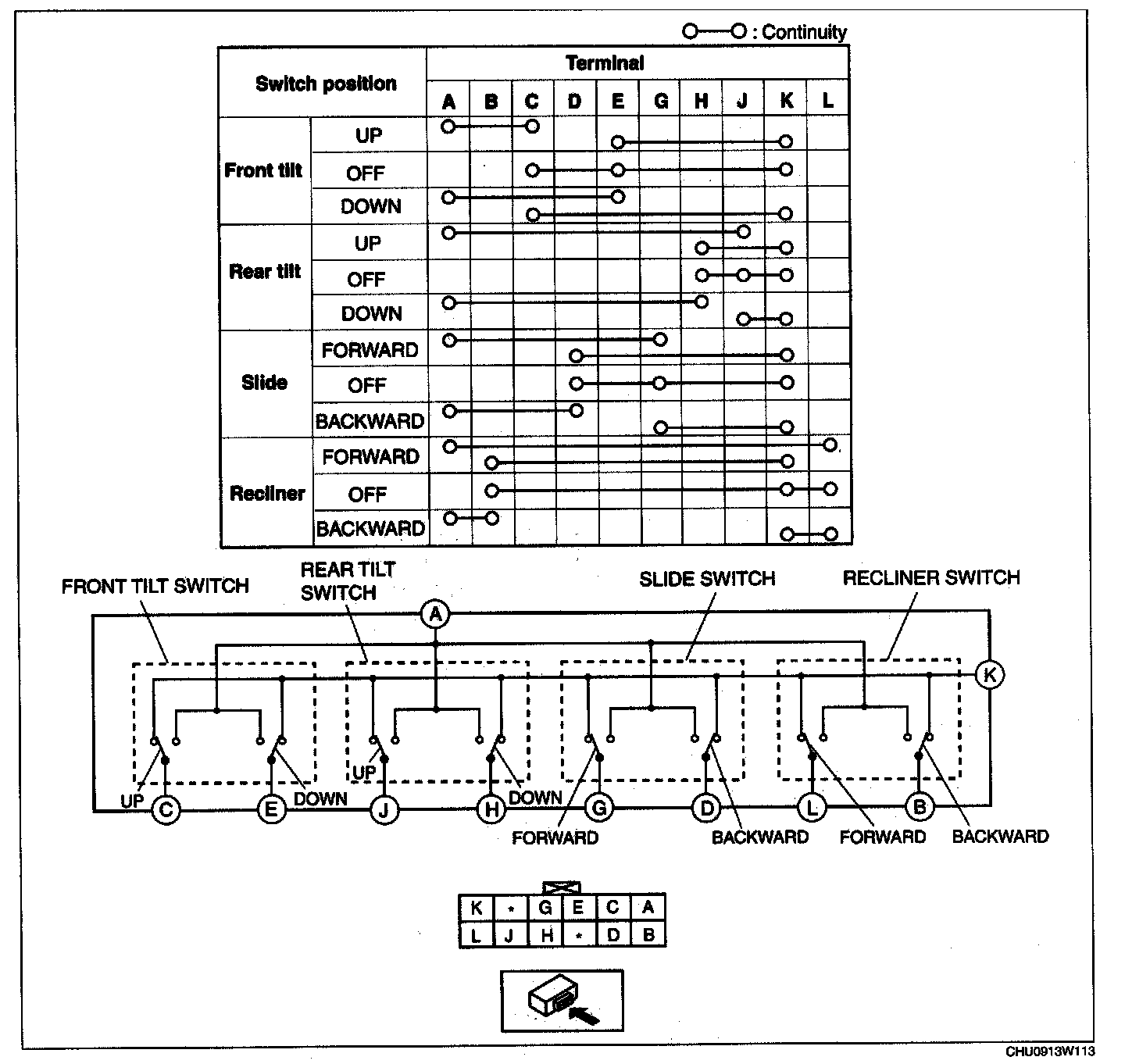 2. Verify that the continuity between the power seat switch terminals is as indicated in the table.