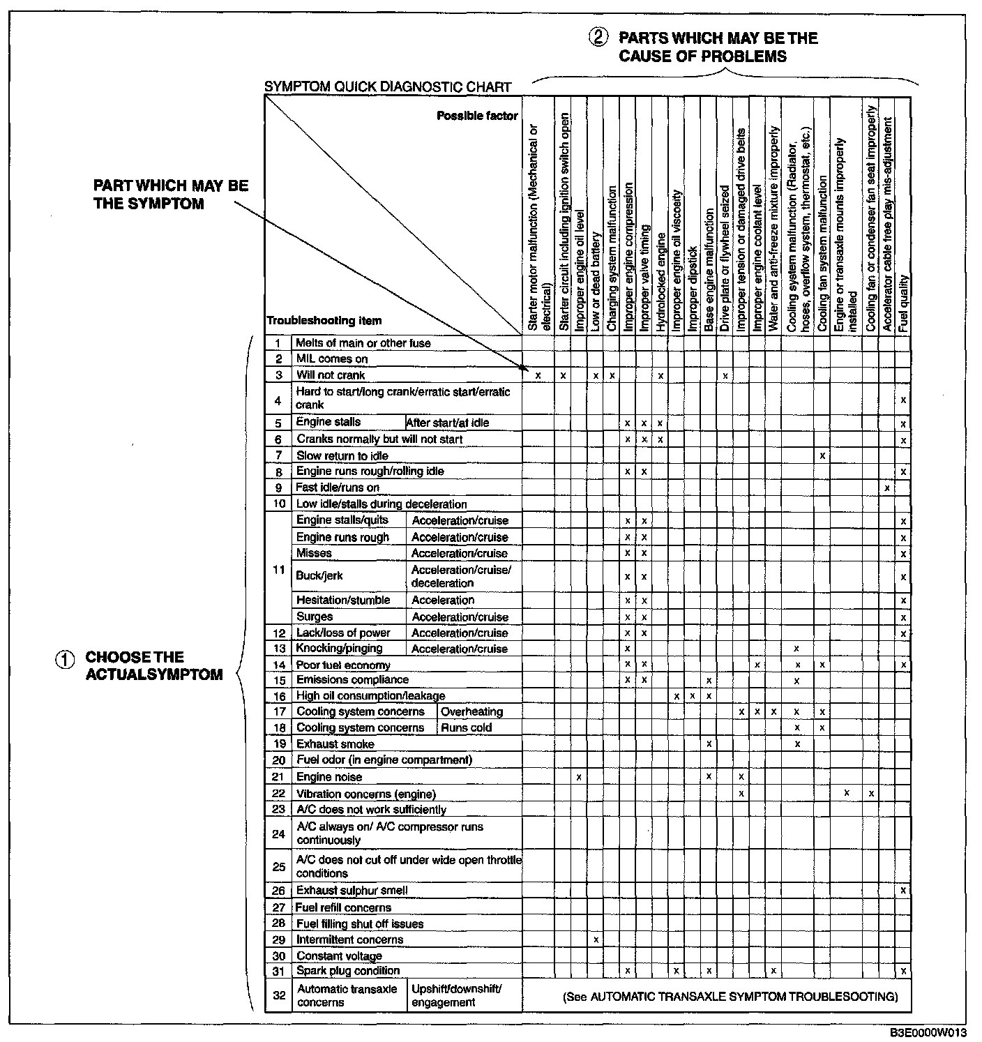 - The chart is effective in quickly narrowing down the relation between symptom and cause of the malfunction. It also specifies the area of the common cause when multiple malfunction symptoms occur.