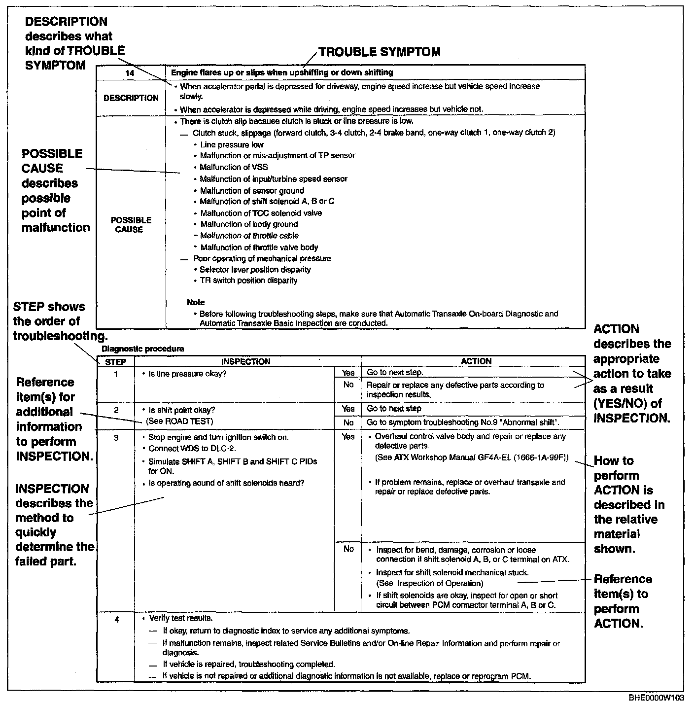 - Symptom troubleshooting shows diagnostic procedures, inspection methods, and proper action to take for each trouble symptom.