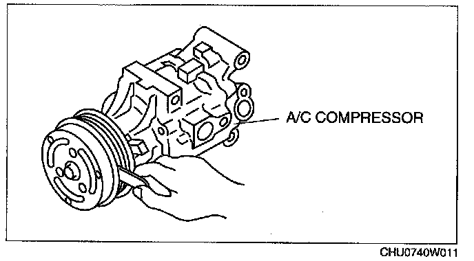 MAGNETIC CLUTCH ADJUSTMENT1. Measure the clearance around the entire circumference between the pressure plate and A/C compressor pulley using a feeler gauge