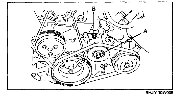 4. Install the drive belt and adjust the drive belt deflection by tightening adjusting bolt B to the specification.