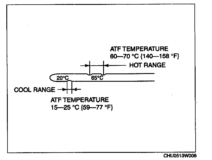8. While the engine is idling, verify that the ATF level is in the HOT (65°C (149°F) range. Add the specified type of ATF if necessary.