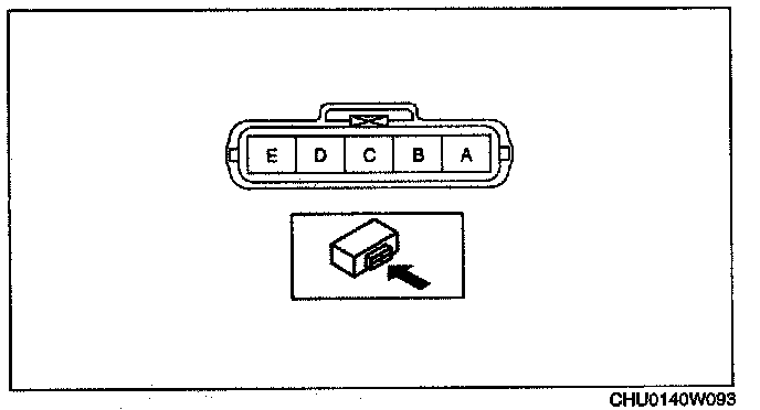 2. Verify that the resistance between MAF sensor terminals D and E is as indicated in the table while blowing hot air gradually into the IAT sensor part built into the MAF sensor.