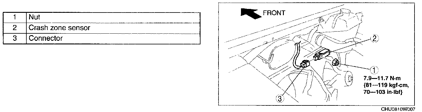 CRASH ZONE SENSOR REMOVAL/INSTALLATIONWARNING: Handling the crash zone sensor improperly can accidentally deploy the air bags and pre-tensioner seat belts, which may seriously injure you. Read the service warnings and cautions before handling the crash zone sensor.