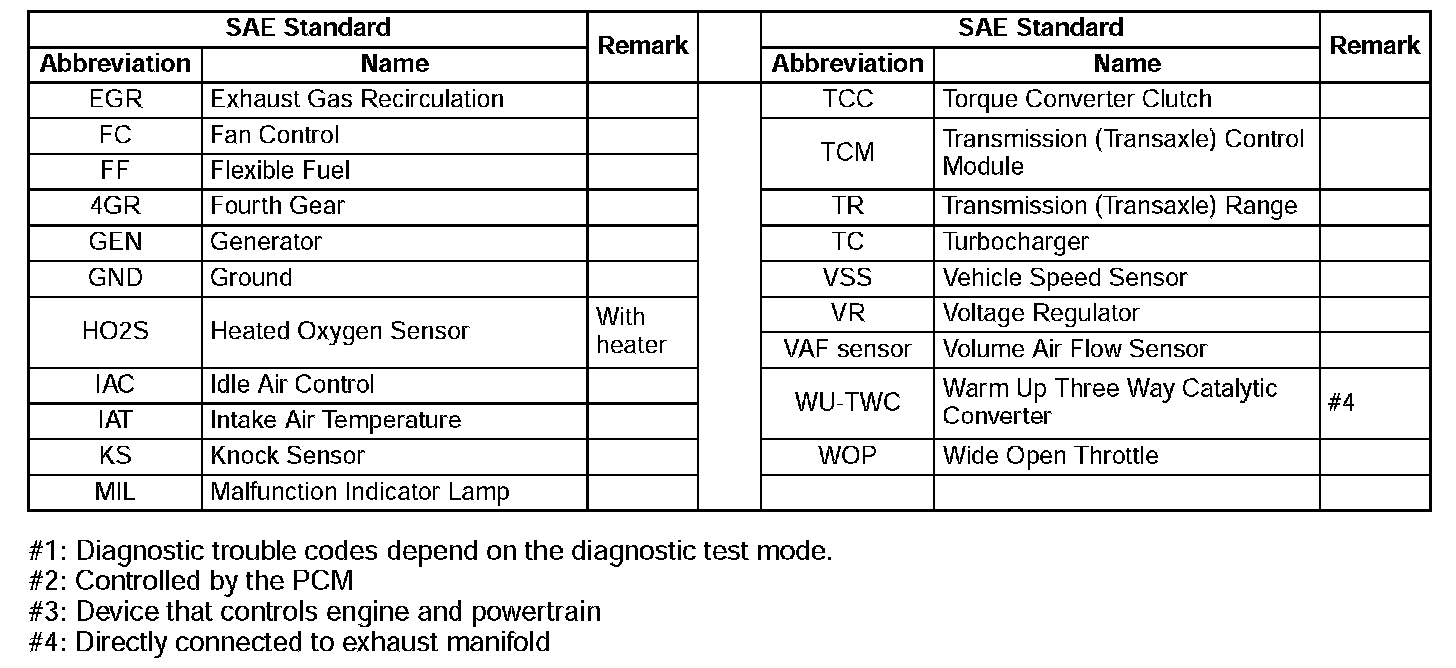 SAE STANDARDS^ In accordance with new regulations, SAE (Society of Automotive Engineers) standard names and abbreviations are now used in this information. The table below lists the names and abbreviations that have been used in Mazda information up to now and their SAE equivalents.