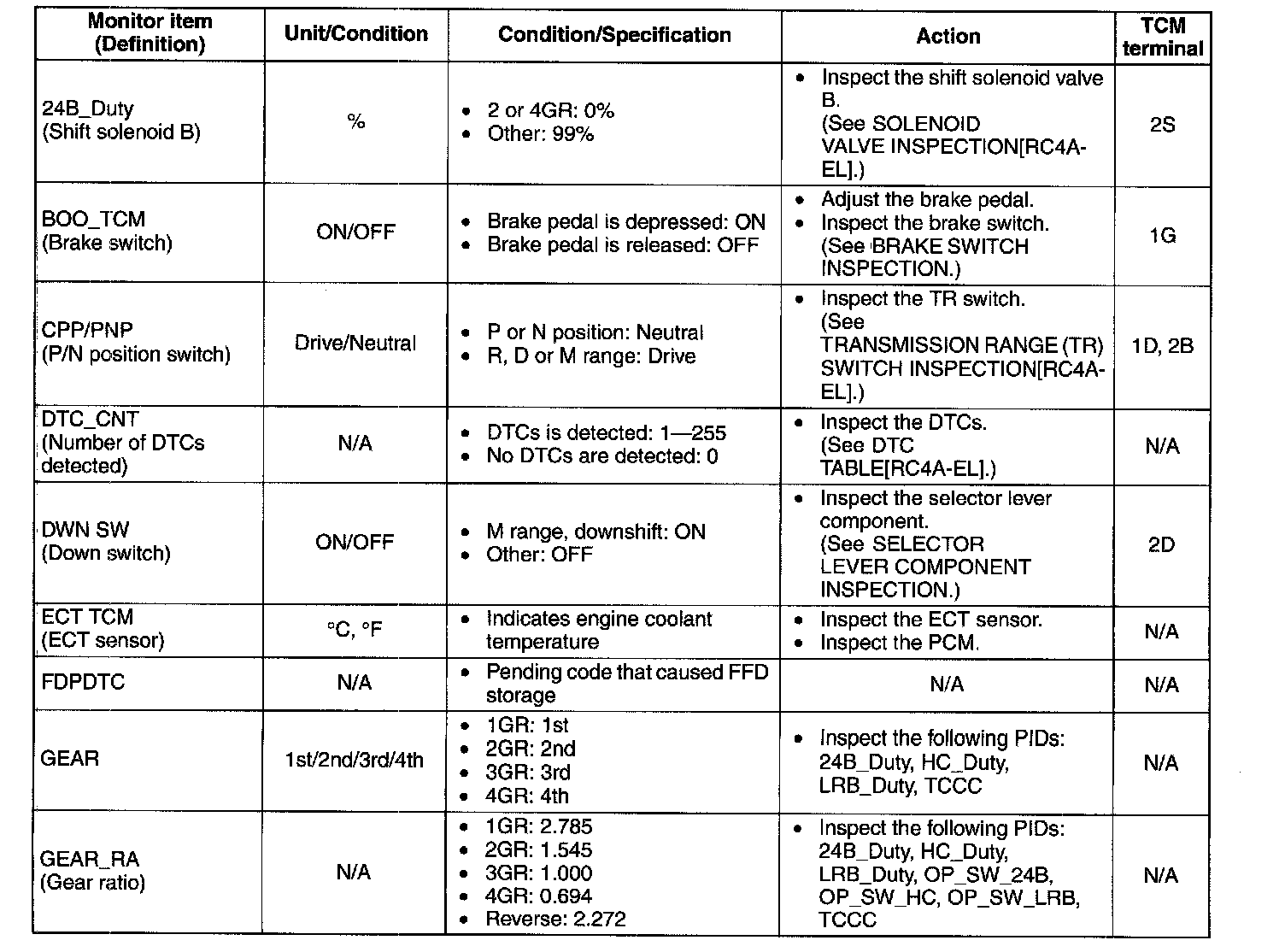 ^ The PID/DATA MONITOR function monitors the calculated value of the input/output signals in the TCM. Therefore, if a monitored value of an output device is not within specification, it is necessary to inspect the monitored value of the input device related to the output device control. Since an output device malfunction is not directly indicated as a malfunction of the monitored value for the output device, it is necessary to inspect the output device individually using the simulation function.