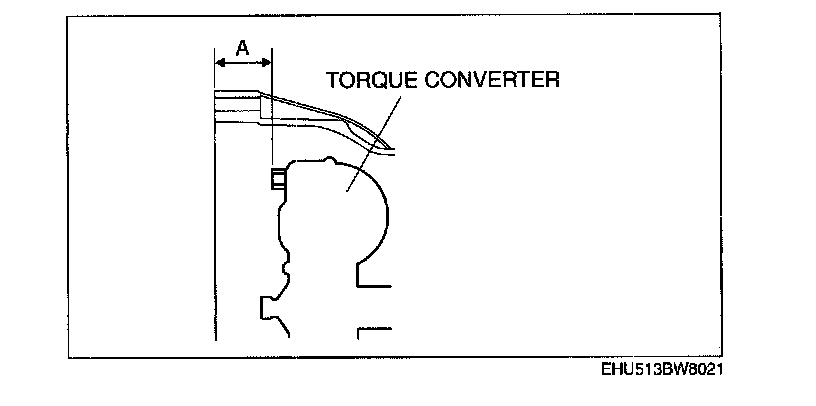 6. To ensure that the torque converter is installed accurately, measure distance A between the end of the torque converter and the end of the converter housing.