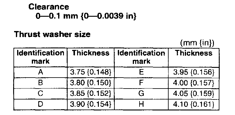 2. Select the new thrust washer from the table so that the clearance measured in Step 1 is within specification, and install it in the countershaft gear with the identification mark facing up.