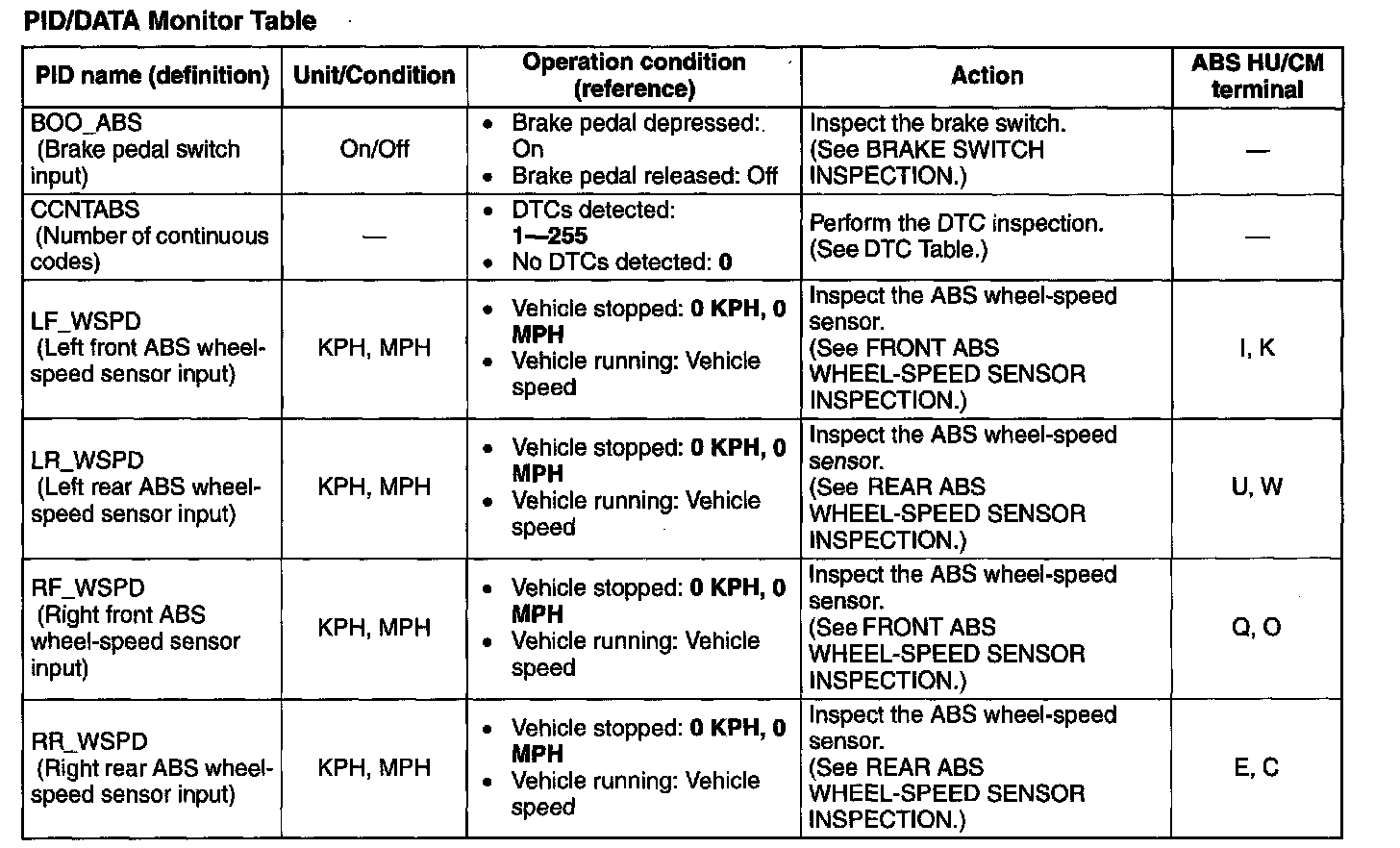 PID/DATA Monitor Table: