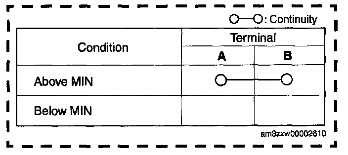 2. Inspect for continuity according to fluid level between the brake fluid level sensor terminals.