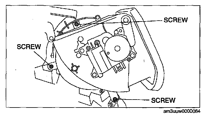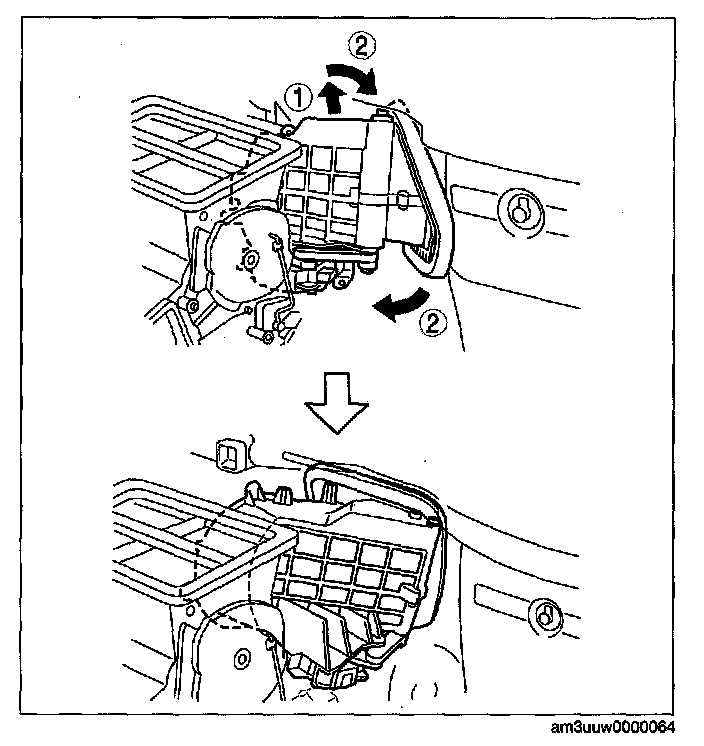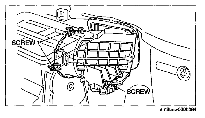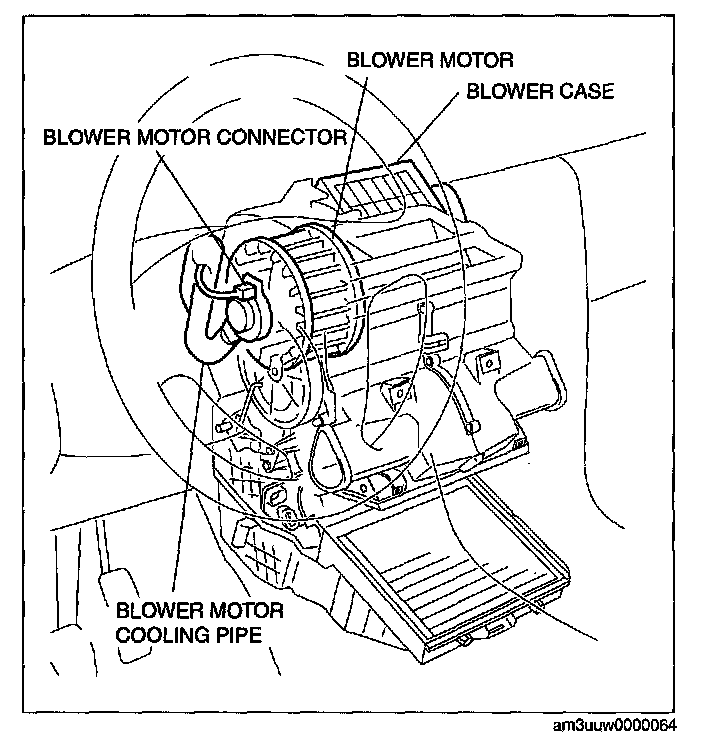 CAUTION: When the blower motor cover is removed, the blower motor could fall in the A/C unit case causing the sirocco fan to be damaged. Therefore another person must hold the blower motor at the installation position.
