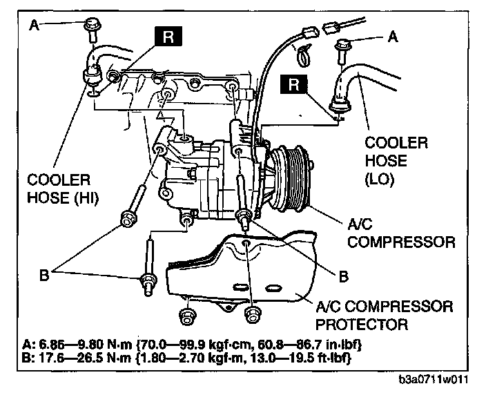 8. Disconnect the cooler hose (LO) and cooler hose (HI). Do not allow remaining compressor oil in the refrigerant line to spill.