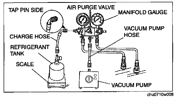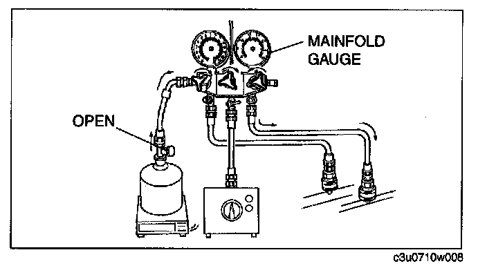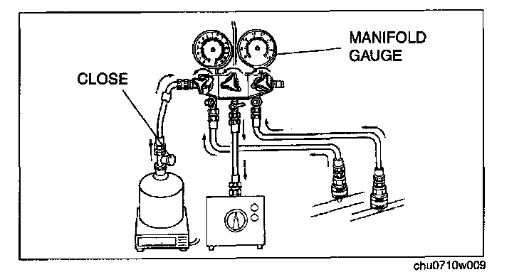 CAUTION: Close the manifold gauge valve immediately after stopping the vacuum pump. If the valve is left open, the vacuum pump oil will flow back into the refrigeration cycle and cause a decrease in the efficiency of the air conditioner.