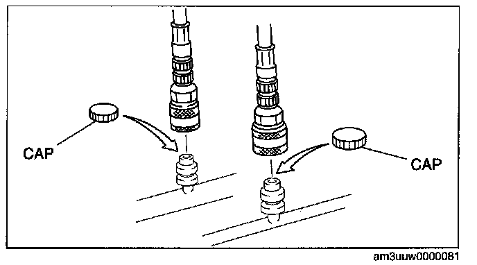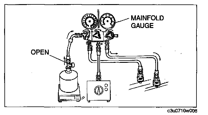 CAUTION: Always being charging of refrigerant from the high-pressure side. If changing is begun from the low-pressure side, the vanes of the A/C compressor will not be released and abnormal noise may result.
