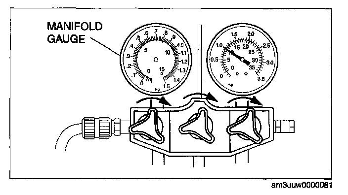 4. When the low-pressure side reading increases to 0.098 MPa {1.0 kgf/sq.cm, 14 psi}, close the high-pressure side valve of the manifold gauge.