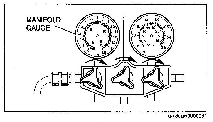 3. Verify that high- and low-pressure side readings of the manifold gauge are at -101 kPa {-760 mmHg, -29.9 inHg}. Close each valve of the manifold gauge.