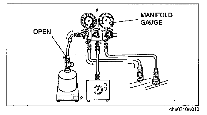 10. Open the low-pressure side valve of the manifold gauge and charge with refrigerant until the weight of the refrigerant tank has decreased regular amount from the amount in Step 2.