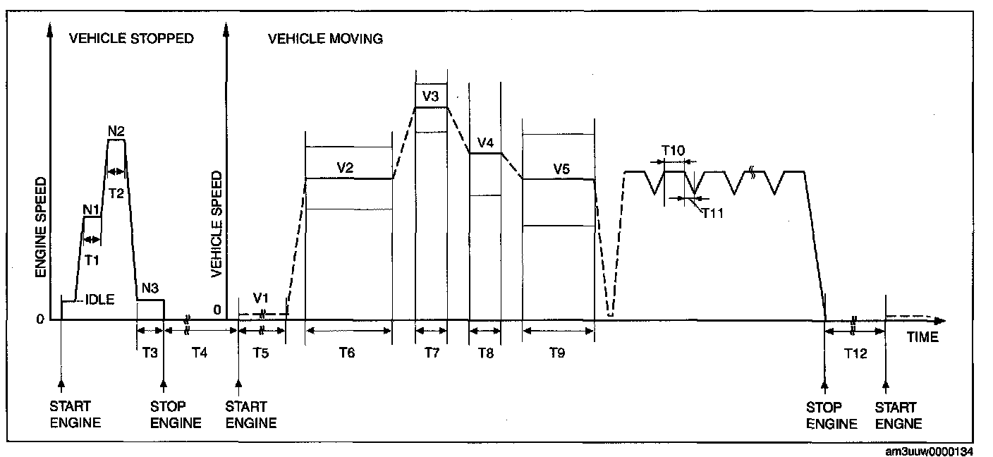 5. With the vehicle stopped, race the engine at the engine speed indicated, and then drive the vehicle as shown in the graph. The driving conditions before driving at constant speed are not specified. If possible, monitor RPM PID for engine speed during this procedure.