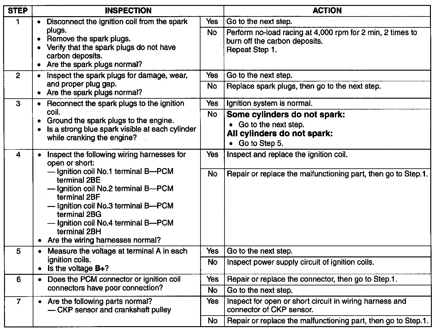 WARNING: High voltage in the ignition system can cause strong electrical shock which can result in serious injury. Avoid direct contact to the vehicle body during the following spark test.