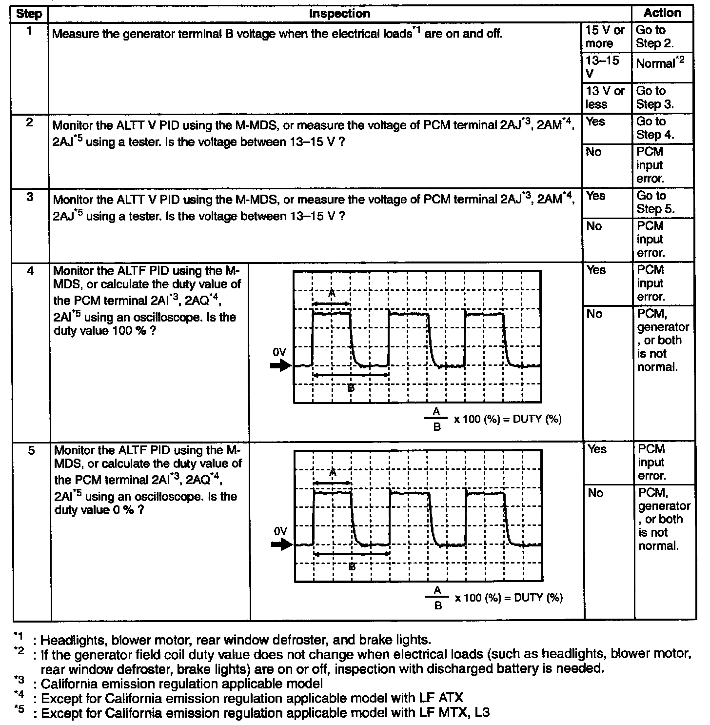 [Ambient temp. 20 °C (68 °F), voltage 13.0 - 15.0 V, both engine and generator are hot]
